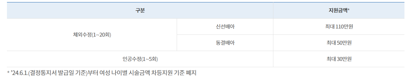 - 신선배아 최대110만원, 동결배아 최대50만원(공난포,미성숙난자 한정)